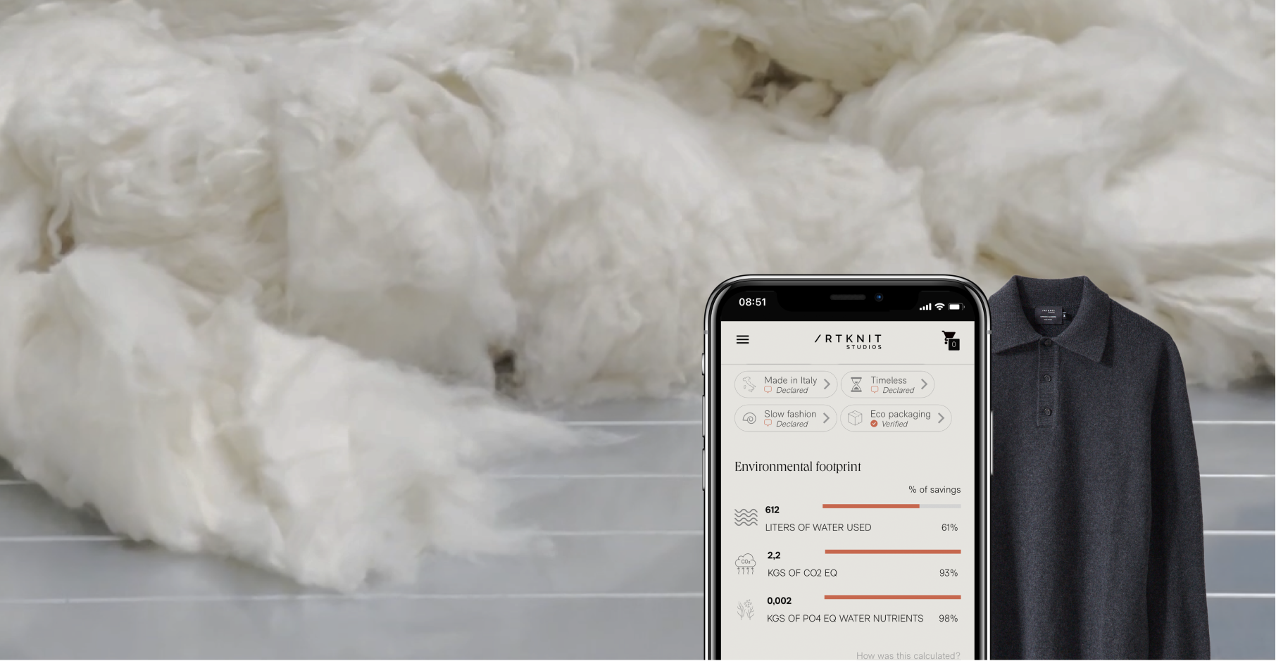 Dans cette section, vous découvrirez l'impact estimé du produit fini en matière de consommation d'eau, d'émissions de CO2 et de rejets de nutriments dans l'eau. Vous pouvez également constater les gains de ressources par rapport à un produit standard, fabriqué sans matériaux responsables et en production délocalisée.